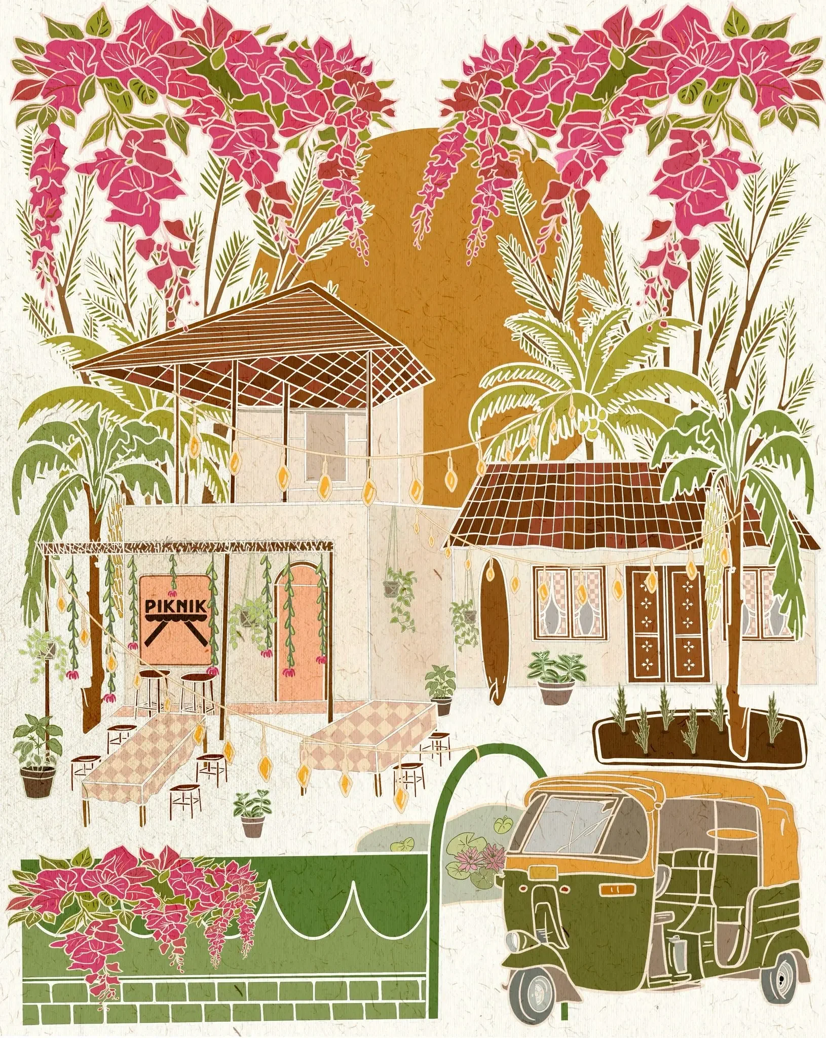 PikNik at Varkala in Kerala - our birthplace! Illustration by Flossie Scott at slowlifedesign.co.uk